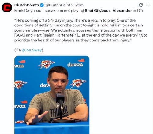 这场比赛亚历山大在常规时间四节打完后就被DNP了,第四节还剩2分01秒卡鲁索三分命中,末节还剩1分23秒卡鲁索三分再度命中,没有这两个三分雷霆已经跪了。约基奇篮下完成勾手后,终场前26秒亚历山大撤步三分被布劳恩大帽,随后卡约三分反绝杀也未能命中。