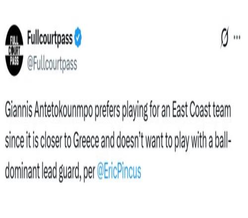 Pincus在文中指出,字母哥更偏爱东海岸,那里距离希腊更近(无论是飞行距离还是时区)。有人称,字母哥怀念和霍勒迪、米德尔顿搭档的日子,那是他2021年夺冠的队友。这并不意味着他想重组当年阵容,只是字母哥不希望和大量持球的核心控卫搭档,他更想成为球队进攻的绝对发动机(霍勒迪和米德尔顿都能无球配合他)。