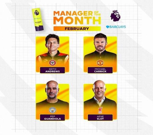 北京时间3月5日,英超官方公布了2月最佳主帅的候选名单,其中安德鲁斯、卡里克、瓜迪奥拉和斯洛特在列。