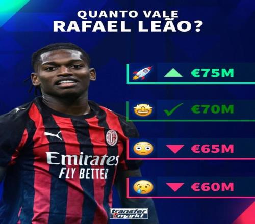 北京时间3月17日,德转预热了AC米兰前锋拉斐尔-莱奥的身价更新,他们给出了四个选项,最高涨至7500万欧元,最低跌至6000万欧元。