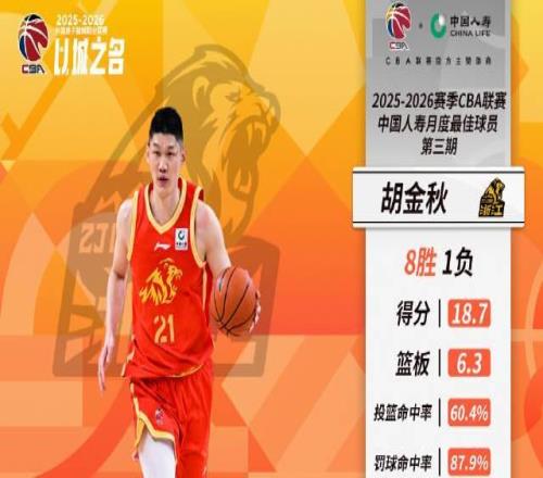 CBA官方写道:“浙江广厦篮球俱乐部球员胡金秋在第24-32轮的比赛中,出战9场并率队取得8胜1负的战绩,他场均出场26分钟,能够得到18.7分、6.3篮板、1.4助攻的数据,投篮命中率60.4%、罚球命中率87.9%。”
