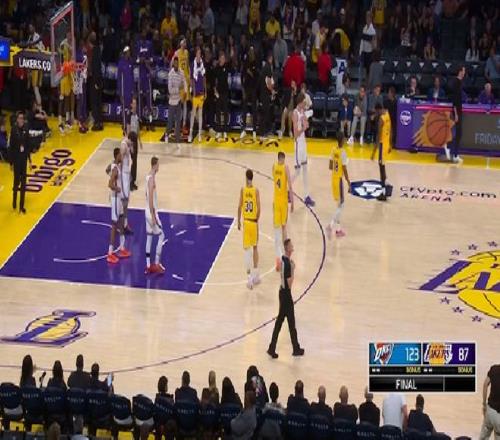 最终雷霆123-87狂虐湖人,赢了36分之多,且每节都是净胜。
