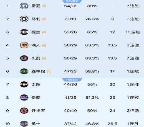 北京时间4月9日,NBA常规赛结束多场比赛的争夺,西部前2名雷霆跟马刺都取得了胜利。其中雷霆以128-110力克快船,而马刺以112-101击败开拓者。如此一来,雷霆提前锁定了西部常规赛第1,也是全联盟第1。NBA西部前10悬念不大!最终排名预测:湖人第5避开火箭,快船第9。