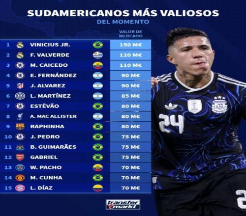 南美球员身价榜:维尼修斯1.5亿欧居首