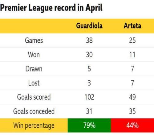 这样推测走势是不是更合理?但别忘了推算都不能当成现实,具体情况还得继续观望。只能说形势对枪手而言确实非常凶险,无论是看当下状态还是历史经验。本赛季之前,4月就是阿尔特塔带队英超成绩最差的月份,胜率仅为44%,而瓜迪奥拉偏偏又最会在这个月份抢分,历年来英超4月带队胜率高达79%。如果这种“最弱”对“最强”的情况再次重演,那等不了多久,枪手就得说“来年再战”了。