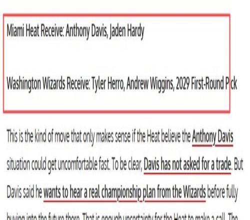 浓眉的名字出现在热火的交易名单中,或许令人有些意外,但仔细想想,却又在情理之中。自从被独行侠交易到奇才后,浓眉的处境就十分尴尬,奇才本赛季17胜65负排名联盟垫底,重建遥遥无期,而浓眉曾明确表示,希望听到奇才的争冠计划,否则不会排除提出交易申请,这就是热火的机会。FW给出的交易方案如下:热火送出泰勒·希罗、安德鲁·威金斯以及2029年首轮选秀权,得到浓眉和贾登·哈迪。