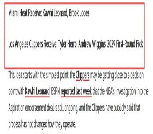 伦纳德或许是热火最现实的“冠军拼图”。快船和热火一样都是附加赛首场出局,伦纳德的合同也剩余最后一年,薪资5030万美元,快船今年夏季大概率会选择及时止损,那伦纳德换一些重建资产。FW给出的交易方案对双方都极具吸引力:热火送出泰勒·希罗、安德鲁·威金斯以及2029年首轮选秀权,从快船换来小卡和大洛。这是一笔“3换2”的重磅交易,也是热火最有可能实现的“即插即用”升级。