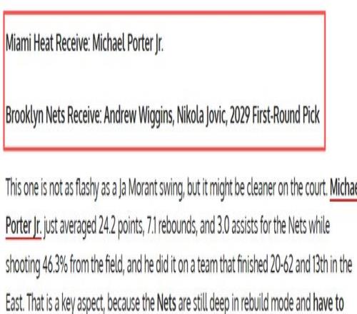 如果说莫兰特是“高风险高回报”,那迈克尔·波特二世就是热火更稳妥的选择。篮网本赛季20胜62负排名东区倒数,重建之旅遥遥无期,虽然波特公开表示想留在篮网,但管理层对他的球队定位并不明确——毕竟,篮网需要的是更年轻、更具培养价值的年轻人,而不是处于合同末年的得分手。FW给出的交易方案如下:热火送出安德鲁·威金斯、尼古拉·约维奇以及2029年首轮选秀权,换来小波特。