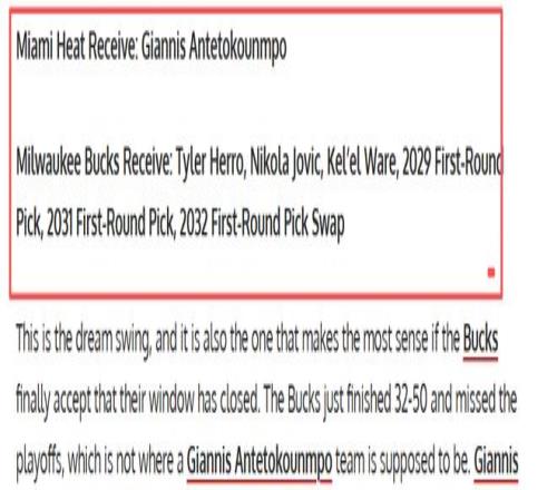 据ESPN报道,早在今年交易截止日前,热火就和雄鹿探讨过字母哥的交易,当时的谈判围绕希罗、凯尔·韦尔以及多个首轮选秀权展开,如今雄鹿未能进入季后赛,字母哥和球队因为出场的问题彻底闹掰,这无疑给了热火再次出击的机会。FW提供的终极交易方案如下:热火送出泰勒·希罗、尼古拉·约维奇、凯尔·韦尔,以及2029年、2031年两个首轮选秀权和2032年首轮选秀权交换权,从雄鹿换来字母哥。
