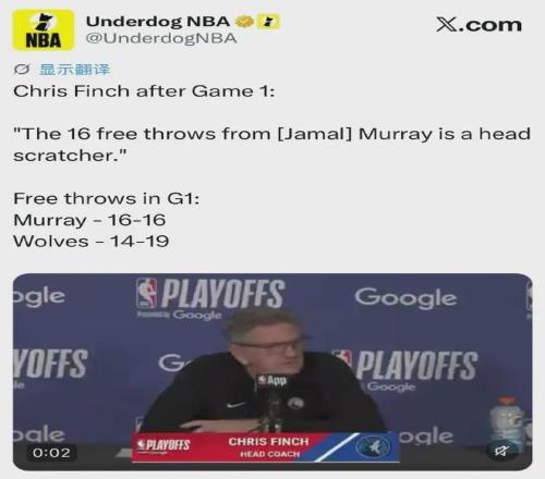 森林狼主帅芬奇倒是对穆雷16次罚球很是不满,声称这令人费解。