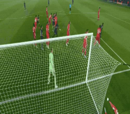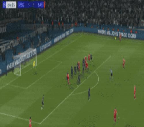 登贝莱主罚,拜仁在防守中明显漏人,内维斯前点攻门,皮球直挂死角。