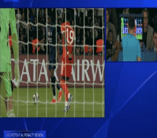 上半场补时阶段,登贝莱的传中打在阿方索·戴维斯的手臂上,VAR介入,裁判回看后判罚点球。
