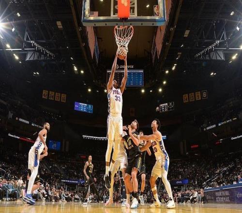 北京时间2月4日,NBA常规赛,勇士主场对阵费城76人。赛前,勇士官方确认斯蒂芬·库里因膝伤缺席,一同高挂免战牌的还有库明加和巴特勒。比赛中。图源:视觉中国比赛开始后,勇士连续命