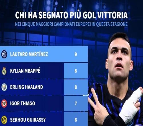 本赛季五大联赛制胜球进球榜:劳塔罗、姆巴佩、哈兰德前三