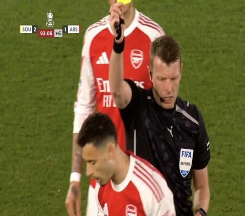 足总杯1/4决赛,阿森纳客场对阵南安普顿,阿森纳边锋马丁内利在尾声阶段因推搡主裁被出示黄牌。